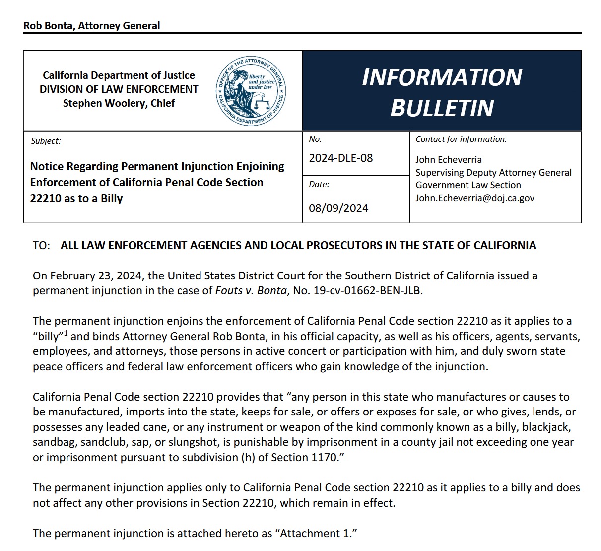 Federal Judge Roger Benitez in the case of Fouts v Bonta recently ruled California’s longtime ban on billy clubs (defined vaguely and potentially including many types of objects, for example any stick intended as a weapon) as an unconstitutional infringement of our right to bear arms.